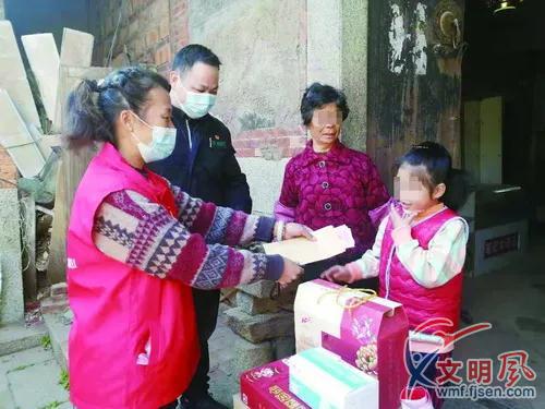 洪美專(左一)為困難家庭的孩子送上慰問(翔安區(qū)委文明辦供圖)