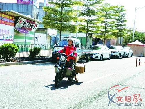中午時(shí)分,洪美專騎著摩托車運(yùn)送物資(翔安區(qū)委文明辦供圖)