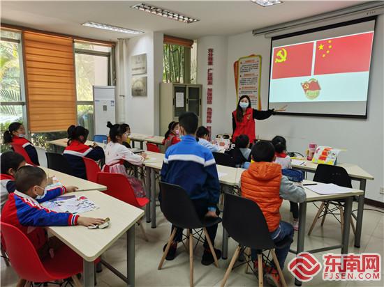 社工帶領(lǐng)青少年認(rèn)識黨旗、黨徽。(康城社區(qū)新時(shí)代文明實(shí)踐站 供圖)