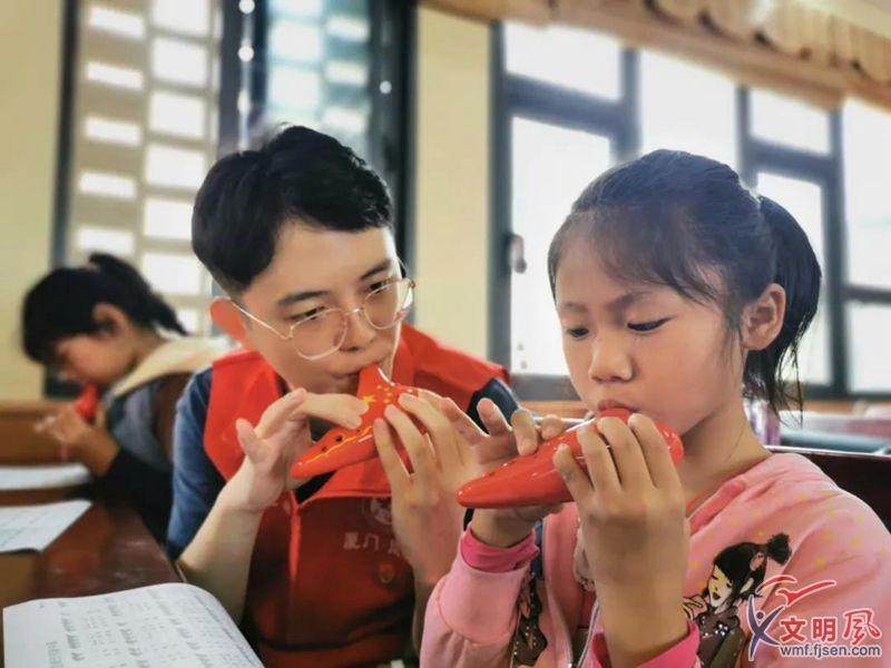 志愿者和孩子們一起學(xué)習(xí)吹奏陶笛。(同心慈善會(huì)供圖)