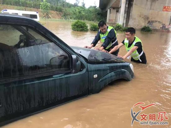 黃匯明(左一)與隊員對受困車開展施援(翔安區(qū)委文明辦供圖)