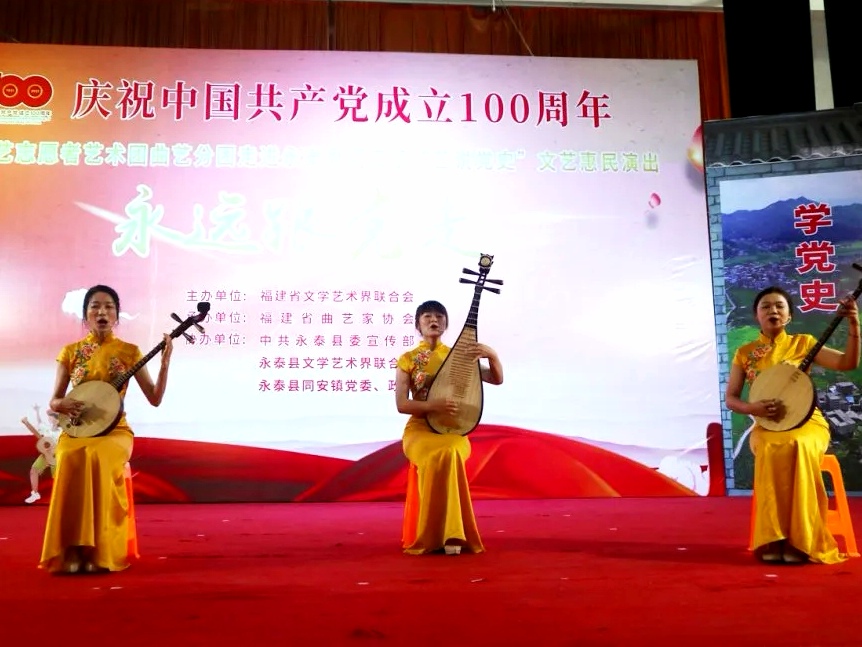 “七溜八溜 不離福州……”5月20日,福建省文藝志愿者藝術(shù)團(tuán)曲藝分團(tuán)走進(jìn)永泰縣同安鎮(zhèn),開展慶祝中國共產(chǎn)黨成立100周年“藝說黨史”文藝惠民演出活動,文藝工作者們以載歌載舞等文藝匯演的形式,攜手為生活在這里的老人們送上一場豐盛的“文藝大餐”,共同學(xué)習(xí)中國共產(chǎn)黨百年奮斗的光輝歷史,歌頌黨對全國人民的恩情。