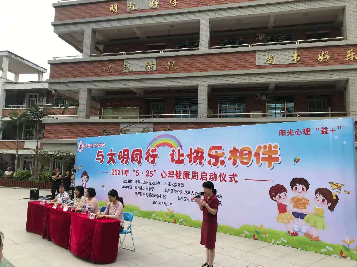 文明風3月25日訊(通訊員楊曄)5月20日,在這到處充滿愛的日子里,豐澤區(qū)陽光心理“益+”“5·25”心理健康周啟動儀式在云谷小學隆重舉行,活動主題旨在宣傳“與文明同行,讓快樂相伴”。此次活動得到了豐澤區(qū)文明辦、豐澤區(qū)教育局、豐澤區(qū)東海街道云谷社區(qū)、豐澤區(qū)心理關(guān)懷支援服務(wù)隊、泉州市旭龍社會服務(wù)中心的大力支持。