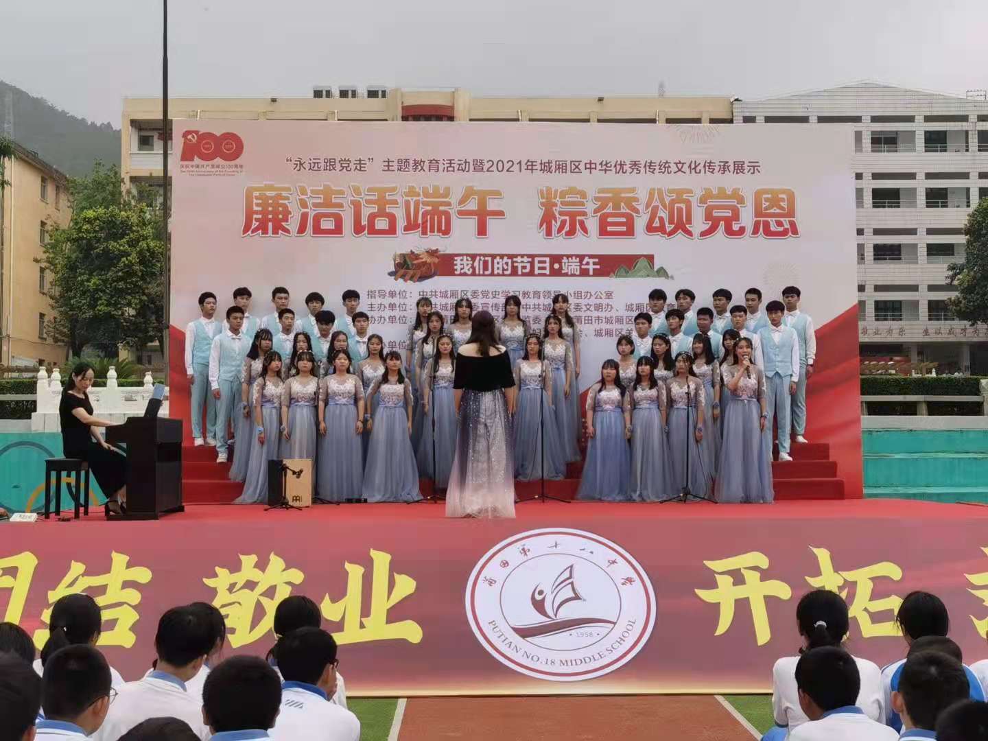 本次活動以“廉潔話端午 粽香頌黨恩”為主題,設展演會場和觀摩會場。展演會場上學生代表介紹莆田端午節(jié)由來、講述歷史上愛國志士的故事。學生代表現場演唱自創(chuàng)歌曲《因為有你》、朗誦《百年頌歌》,用鏗鏘有力的音調唱響一曲信仰之歌,表達了深沉的愛國之情。該校百靈鳥合唱團現場合唱《我愛你中國》《走向復興》,用最美妙的歌聲來表達作為兒女的對祖國母親的依戀之情。與會人員在“廉潔話端午 粽香頌黨恩”展板上簽名承諾,用實際行動,摒棄舊俗陋習,倡樹移風易俗新風,共同營造健康向上、文明祥和的節(jié)日氛圍。
