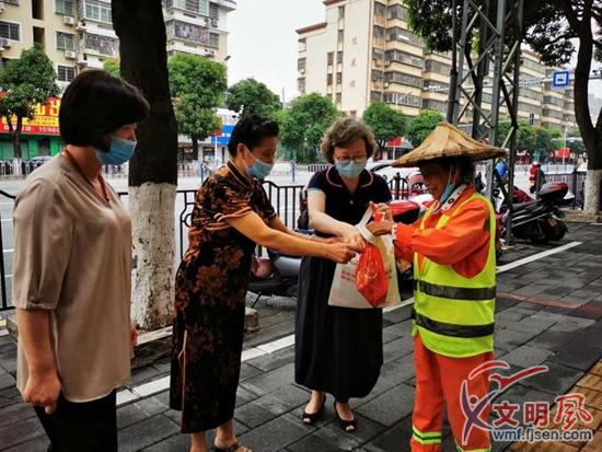 吳招治(左二)與巾幗志愿者一道將粽子送給環(huán)衛(wèi)工人。(同安區(qū)婦聯(lián)供圖)