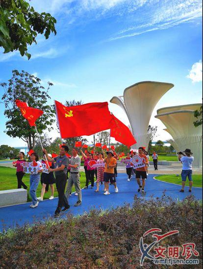 碧海藍(lán)天,微風(fēng)陣陣。6月12日下午5點(diǎn)多,同安區(qū)西柯鎮(zhèn)東海社區(qū)紫金公園內(nèi),許多市民游客正帶著孩子游玩。突然間,一群揮舞黨旗國(guó)旗、身著紅馬甲的志愿者出現(xiàn)在廣場(chǎng)上,他們高唱著《我的祖國(guó)》,拉開了東海社區(qū)“頌歌獻(xiàn)給黨 奮進(jìn)新時(shí)代”主題快閃活動(dòng)的序幕?!耙粭l大河波浪寬,風(fēng)吹稻花香兩岸,我家就在岸上住……”優(yōu)美抒情歌聲表達(dá)著對(duì)黨的熱愛,市民游客也被感染,從廣場(chǎng)四面八方朝音樂起處、紅旗飛揚(yáng)處聚集,參與到合唱中來。