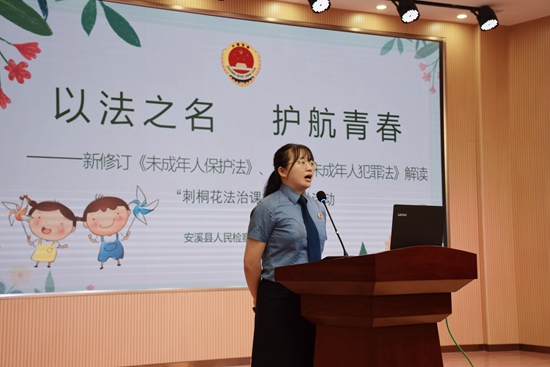 活動(dòng)現(xiàn)場(chǎng),安溪第十一小學(xué)校組織表演了歌曲《游子吟》、快板《喜慶建黨一百年》、合唱《我和我的祖國(guó)》等精彩節(jié)目。隨后,縣人民檢察院檢察官助理鐘秋梅講授《以法之名 護(hù)航青春》專題法制課,對(duì)新修訂《未成年人保護(hù)法》《預(yù)防未成年人犯罪法》進(jìn)行解讀。最后,活動(dòng)在有獎(jiǎng)知識(shí)問(wèn)答互動(dòng)中圓滿結(jié)束。(安溪縣第十一小學(xué) 黃華玲)