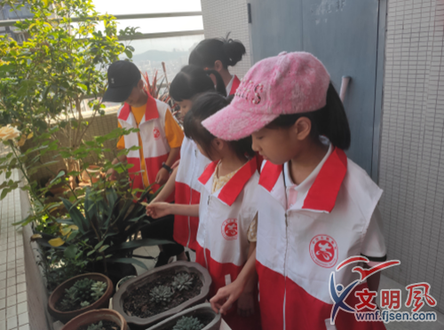 小小志愿者整理小區(qū)的綠植。(同安區(qū)委文明辦供圖)