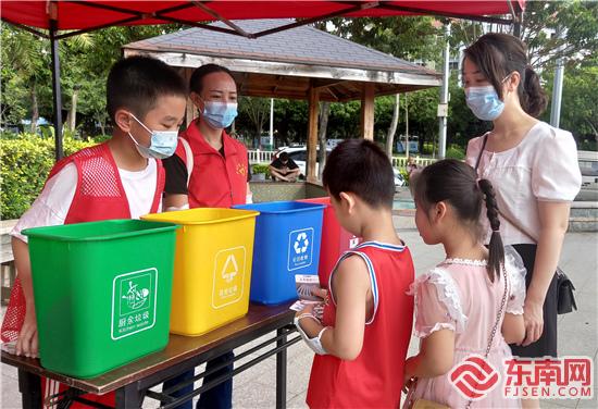 志愿者引導(dǎo)居民參與垃圾分類模擬投放互動(dòng)(集美·誠(chéng)毅志愿者聯(lián)盟供圖)