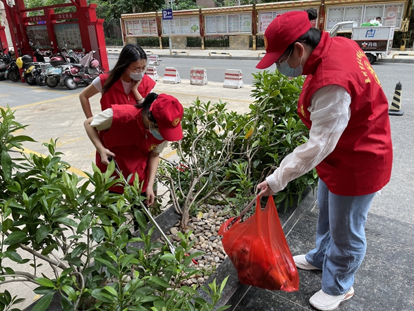 志愿者們積極拾撿東海大街、親子廣場(chǎng)兩側(cè)路段的煙頭、垃圾。林婕 攝