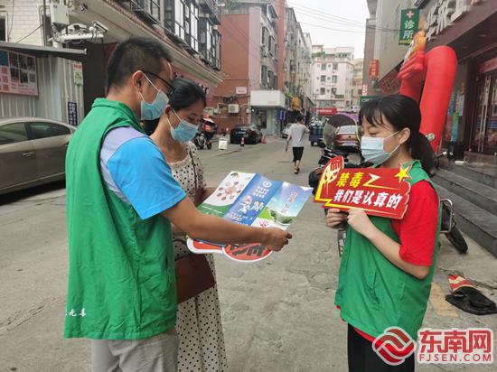 “毒品一日不絕,我們的禁毒就一日不止!”“疫情一天不止,我們的防控就從不松懈!”工作人員還通過(guò)走訪社區(qū),向居民發(fā)放有關(guān)禁毒知識(shí)的宣傳單,并邀請(qǐng)居民同禁毒標(biāo)語(yǔ)合影,營(yíng)造防疫禁毒的濃厚氛圍。