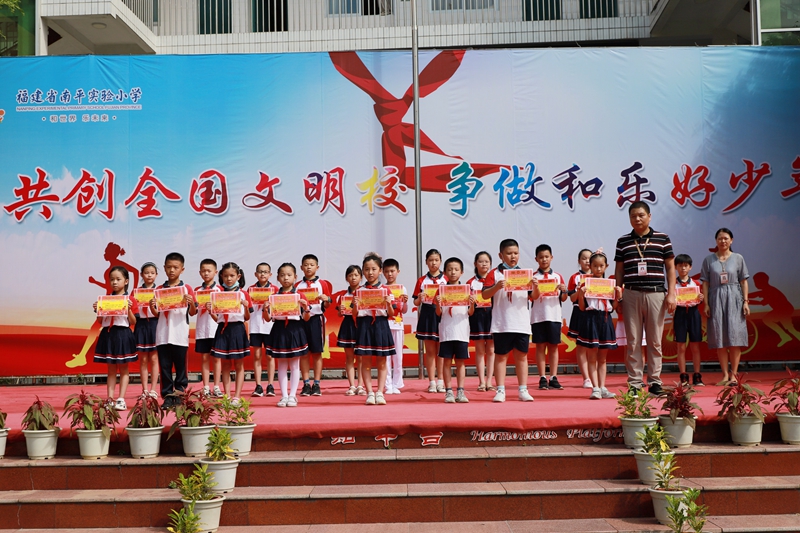 隨后,學(xué)校領(lǐng)導(dǎo)為學(xué)校評(píng)選出來(lái)得2020-2021學(xué)年南平實(shí)驗(yàn)小學(xué)“校園和樂(lè)好少年”和“新時(shí)代十佳和樂(lè)好少年”頒發(fā)獎(jiǎng)狀。在開(kāi)學(xué)典禮結(jié)束后,各年級(jí)借助班隊(duì)課開(kāi)展了關(guān)于文明特色的主題班隊(duì)課。