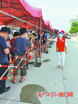 廈門(mén)(同安)可可藝術(shù)志愿服務(wù)隊(duì)第一時(shí)間組織參與志愿服務(wù),支援全員核酸檢測(cè)采樣現(xiàn)場(chǎng)的秩序維護(hù)、信息錄入等工作。(同安區(qū)供圖)