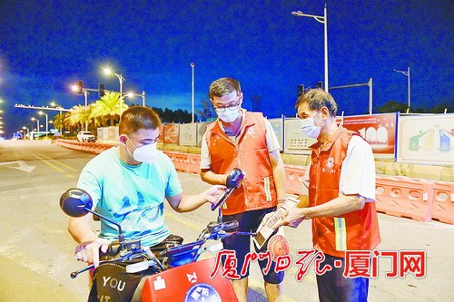 同安區(qū)創(chuàng)業(yè)促進(jìn)會(huì)志愿服務(wù)隊(duì)堅(jiān)守卡口,參與一線防疫。(夏海濱 攝)