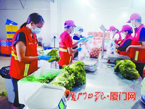 在位于洪塘鎮(zhèn)的閩南果蔬批發(fā)市場(chǎng)內(nèi),同安區(qū)靜善義工協(xié)會(huì)的志愿者們忙著分包蔬菜。(同安區(qū)供圖)