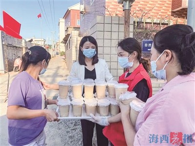 董毓毓(左二)為一線工作人員購(gòu)買冷飲降暑。(翔安區(qū)委宣傳部供圖)