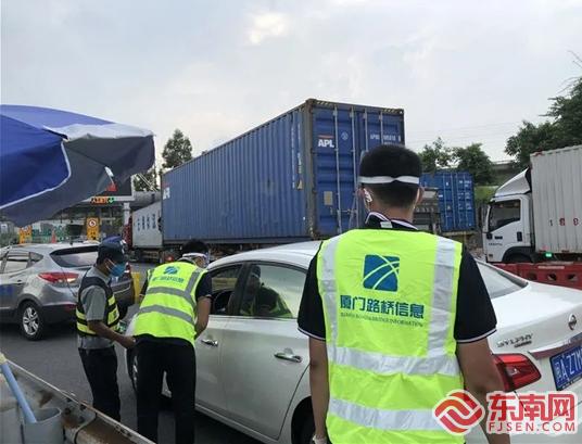 “一路先鋒”志愿者對(duì)來(lái)返駕駛員、乘車(chē)人員進(jìn)行防疫檢查。(廈門(mén)路橋信息股份有限公司一路先鋒志愿服務(wù)隊(duì)供圖)