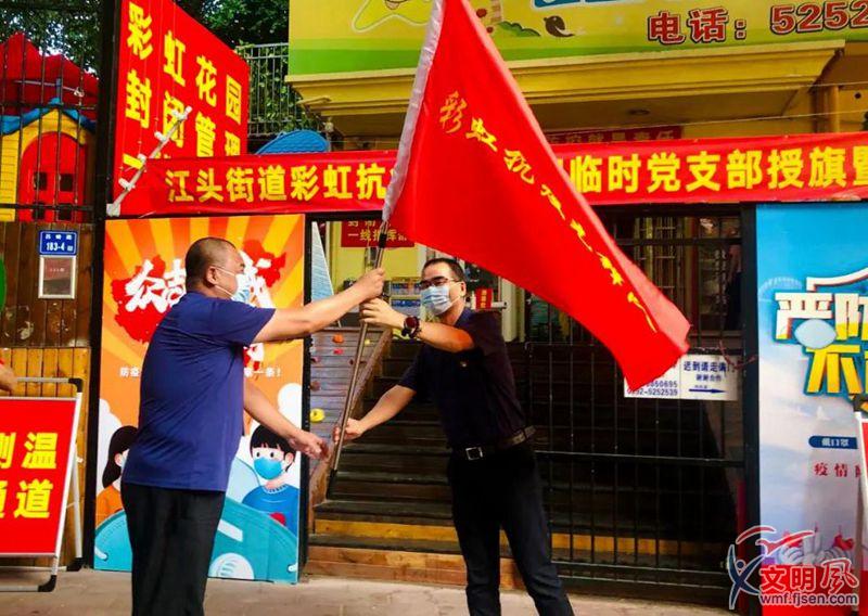 文明風(fēng)9月29日訊(通訊員 鄒玒)“聽(tīng)黨話、跟黨走,抗疫情、我先上;當(dāng)先鋒、打頭陣,來(lái)能戰(zhàn)、戰(zhàn)必勝。彩虹抗疫,必定有我;疫情不滅,絕不收兵!”28日下午,在廈門(mén)市湖里區(qū)彩虹花園小區(qū)旁,經(jīng)報(bào)一線指揮部批準(zhǔn),彩虹抗疫先鋒隊(duì)誕生了,同時(shí)成立的還有彩虹抗疫先鋒隊(duì)臨時(shí)黨支部,40多名一線抗疫人員代表熱情高漲、斗志昂揚(yáng),誓言“彩虹抗疫,必定有我;疫情不滅,絕不收兵”。