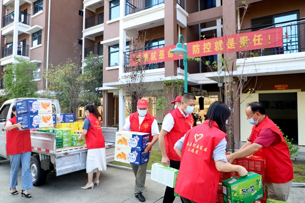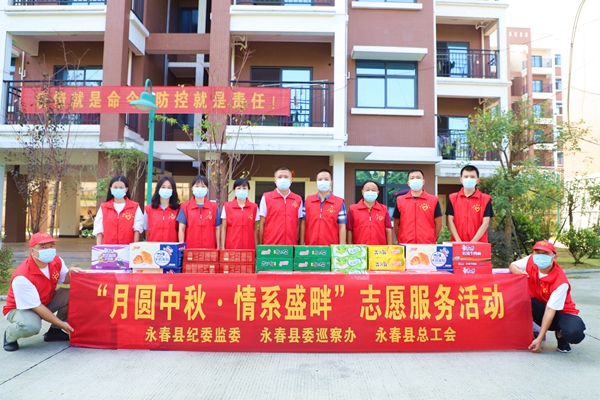 9月16日,永春縣紀(jì)委監(jiān)委、縣委巡察辦、縣總工會(huì)聯(lián)合開展“月圓中秋·情系盛畔”志愿服務(wù)活動(dòng),慰問堅(jiān)守在盛畔醫(yī)學(xué)觀察點(diǎn)的工作人員,為他們送去節(jié)日的祝福及方便面、面包、酸奶、菊花茶、冬瓜茶等愛心物資。(陳躍虹)