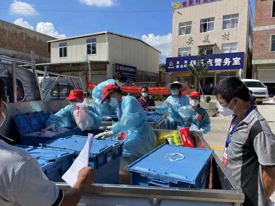 志愿者在龍涓鄉(xiāng)進(jìn)行配送物資。安溪團(tuán)縣委 供圖