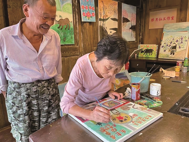 村民繆月仙在畫畫。顏勇金攝