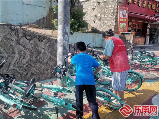 志愿者與孩子一起整理自行車。林晨茜 攝
