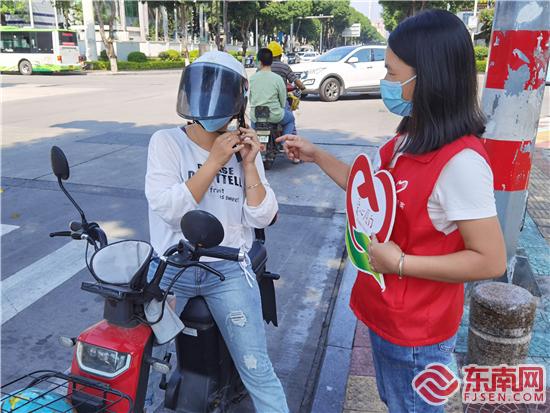 志愿者提醒摩托車司機(jī)正確佩戴頭盔。林晨茜 攝