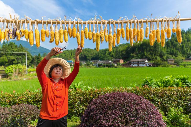 美麗鄉(xiāng)村御簾村豐收曬玉米 明溪縣委文明辦
