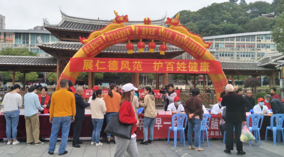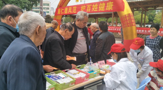 護士給群眾開展量血壓、測心率、測血糖等體檢項目,免費給群眾發(fā)放現(xiàn)場醫(yī)療專家開具的處方藥品。