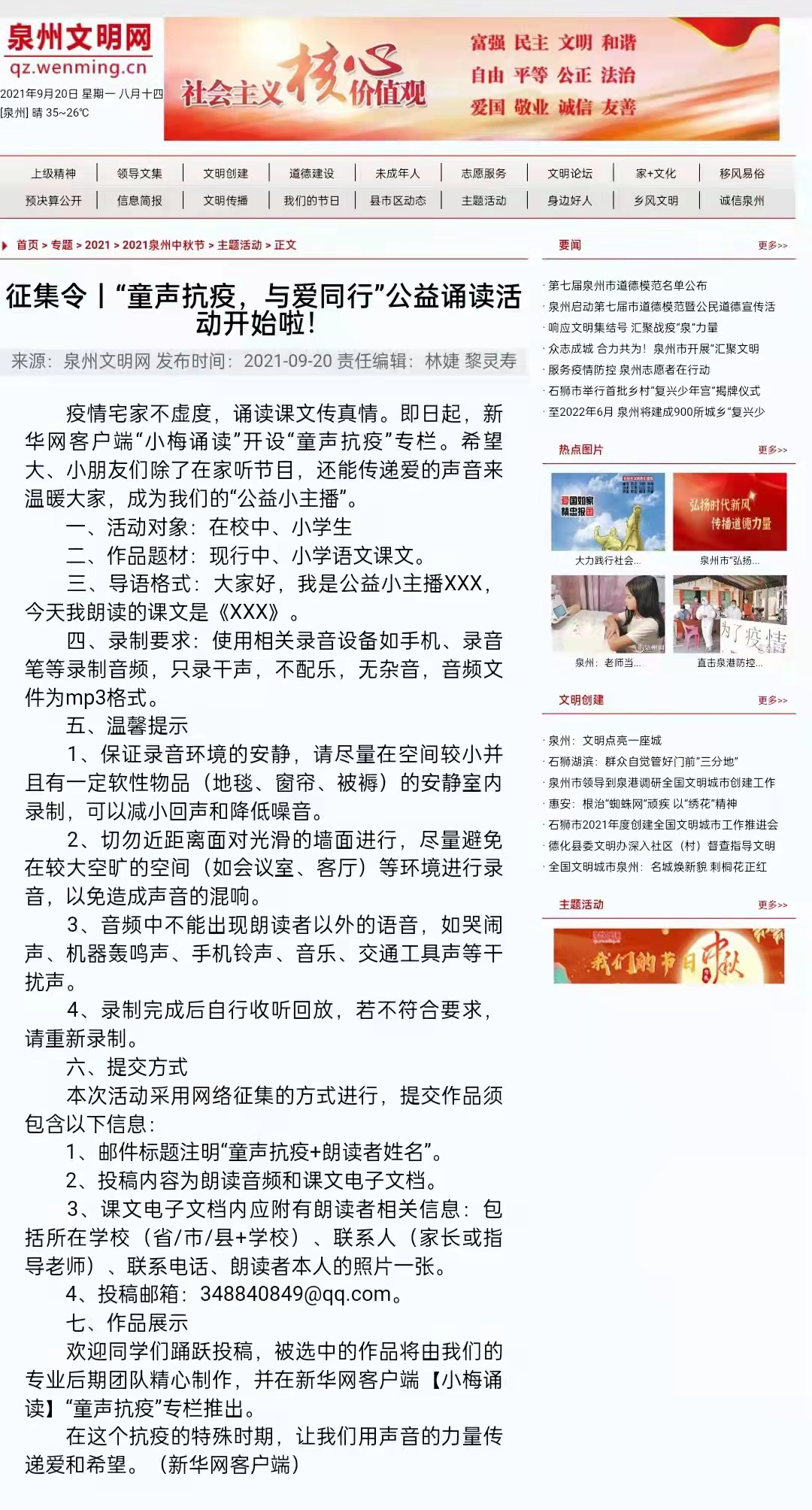 自去年1月份以來,該縣依托五里街中心小學(xué)的“小梅誦讀”公益平臺,發(fā)起“童聲抗疫 與愛同行”音頻作品征集活動,引導(dǎo)孩子們用聲音傳遞真情,用文字記錄美好,以實(shí)際行動支持戰(zhàn)“疫”。該活動開展以來,迅速得到各媒體和廣大師生的熱情支持,多個省的上千名“誦讀達(dá)人”報送了應(yīng)征作品。該平臺先后制作推出“可愛的中國”“逆行之光”等誦讀專輯,累計發(fā)布誦讀作品700多篇新華社客戶端、新華網(wǎng)客戶端、中國文明網(wǎng)、學(xué)習(xí)強(qiáng)國、中央廣播電視總臺云聽、光明日報閱讀公社、福建日報閩南網(wǎng)、泉州文明網(wǎng)以及中國搜索、喜馬拉雅等十多個融媒體平臺同步推送,閱讀量突破2億次。特別是從今年5月起,該團(tuán)隊推出《課本里的紅色印記》專輯,通過誦讀課本里的紅色故事,讓廣大青少年從革命精神中感知責(zé)任使命,在歷史坐標(biāo)中強(qiáng)化時代擔(dān)當(dāng),引發(fā)眾多省內(nèi)外在校生廣泛共鳴,僅活動征集令就達(dá)到154萬的閱讀量?!妒昵暗幕貞洝贰栋伺督贰肚遑殹贰恶R背上的小紅軍》《軍魂》《金色的魚鉤》等一大批紅色經(jīng)典文學(xué)作品透過清亮的童聲得到了更好更廣泛的傳揚(yáng),浸潤了青春。