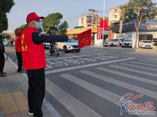 志愿者在路口引導(dǎo)著車(chē)輛、行人通行(翔安區(qū)委文明辦供圖)