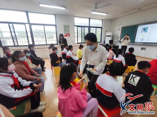 為孩子們發(fā)放由清華大學志愿者團隊寄來的手寫明信片(翔安新圩鎮(zhèn)供圖)