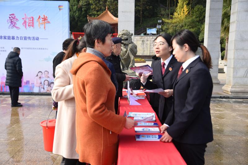 文明風(fēng)11月25日訊(通訊員黃志宏 梁佳鶴 劉紅 鄭小燕)為深入貫徹習(xí)近平關(guān)于注重家庭家教家風(fēng)建設(shè)重要論述精神,大力加強(qiáng)家庭文明建設(shè),弘揚(yáng)社會(huì)主義家庭文明新風(fēng)尚,讓家庭文明成果匯聚成創(chuàng)建全國(guó)文明城市的巨大力量,在“國(guó)際消除家庭暴力日”來(lái)臨的11月25日,由南平市婦聯(lián)、司法局、建陽(yáng)區(qū)婦聯(lián)、法院、檢察院、公安局、司法局和建陽(yáng)陽(yáng)光志愿服務(wù)中心共同舉辦的“家無(wú)暴·愛(ài)相伴”反家暴日宣傳活動(dòng)在建陽(yáng)潭山公園廣場(chǎng)舉行。