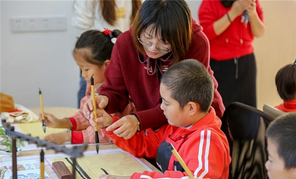小朋友在老師的指導下進行書法練習 許雙萍/圖