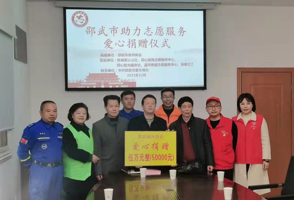 在捐贈儀式中,邵武市泉州商會為鐵城愛心公社、同心助殘志愿服務中心、同心陽光服務社、藍天救援中心、春暖社工等5個志愿服務組織愛心捐贈5萬元整。