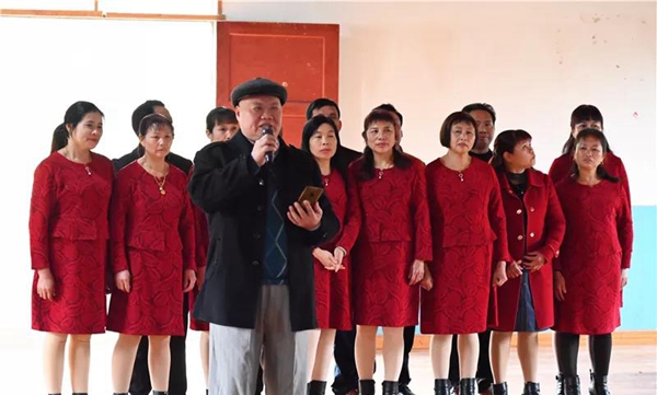 村里山歌隊(duì)的林女士顯然是有備而來,順著林萬金的上句聲情并茂地對唱道:“鴻尾黨政學(xué)六中,兩個確立記心中。十個堅(jiān)持聚民心,同心同德立新功?!?/p>