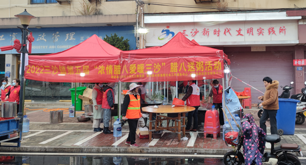 圖為三沙鎮(zhèn)新時(shí)代文明實(shí)踐所組織三沙義工等團(tuán)體在三沙鎮(zhèn)各街區(qū)設(shè)置發(fā)放臘八粥地點(diǎn)為群眾們送去臘八粥。孫彬濤攝