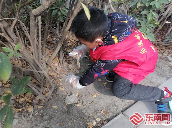 志愿者拔開草叢撿垃圾。(連藝婧 攝)