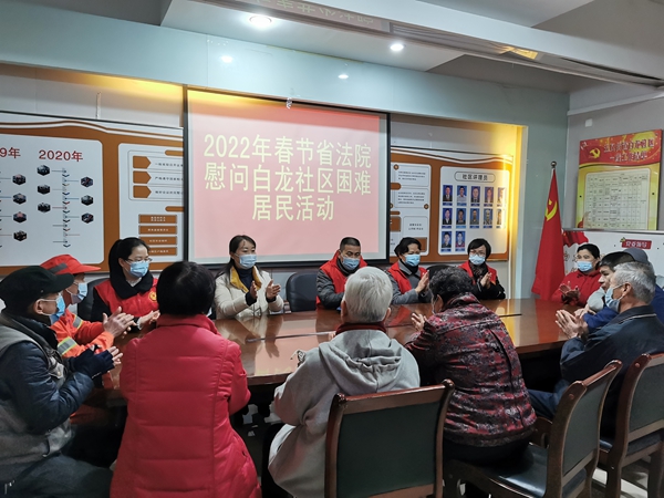 志愿者們與社區(qū)干部群眾座談交流,慰問困難群眾。省法院機(jī)關(guān)黨委供圖