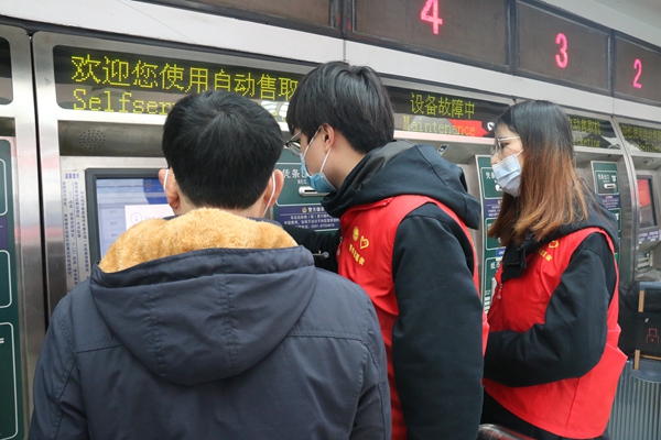 國網(wǎng)福建超高壓公司志愿者為旅客幫助旅客使用自動售取票機(jī)取票。黃丹軍攝