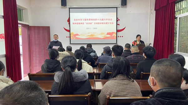 1月18日上午,在全國(guó)林改第一村武平縣捷文村新時(shí)代文明實(shí)踐所演講報(bào)告室座無(wú)虛席,干部群眾戴著口罩,聚精會(huì)神地聆聽(tīng)縣三八紅旗手王麗珍同志宣講十九屆六中全會(huì)精神。這是龍巖市開(kāi)展學(xué)習(xí)宣傳貫徹黨的十九屆六中全會(huì)精神道德典型“巖講家”百場(chǎng)宣講活動(dòng)在武平宣講的第一場(chǎng)。