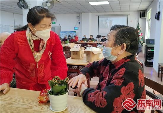 志愿者與老人共植長(zhǎng)壽花(集美銀江路志愿服務(wù)驛站 供圖)