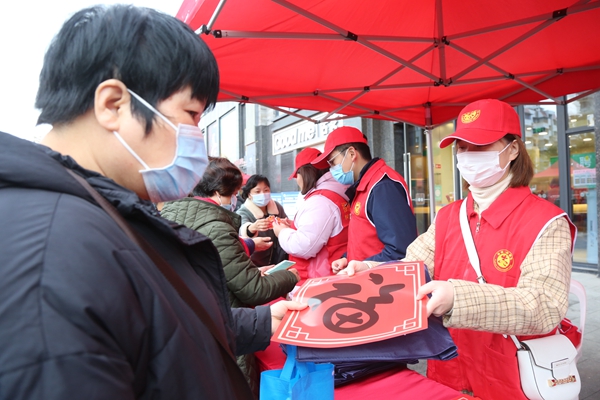 區(qū)委文明辦組織志愿者開展移風(fēng)易俗宣傳,派發(fā)福聯(lián)、核心價值觀購物袋等 倉山區(qū)融媒體中心供圖