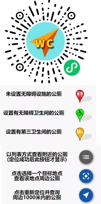 進(jìn)入之后,頁面會自動搜索周邊的公共廁所,并將分布情況在地圖上呈現(xiàn)出來,不同的圖標(biāo)代表公廁的設(shè)施配置情況。同時,點擊對應(yīng)的廁所圖標(biāo),通過手機(jī)的GPS功能,可以導(dǎo)航到距離最近的公共廁所。目前中心城區(qū)111座環(huán)衛(wèi)、園林管護(hù)公廁均被納入其中,利用“互聯(lián)網(wǎng)+”實現(xiàn)公廁精準(zhǔn)定位。