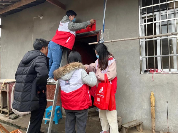 大學(xué)生志愿者入戶慰問送春聯(lián)(葛藤凹社工攝)