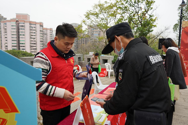 中共倉(cāng)山區(qū)委文明辦志愿者向來(lái)往市民發(fā)放《福建省志愿服務(wù)條例》宣傳折頁(yè)、移風(fēng)易俗宣傳手冊(cè)、新時(shí)代文明實(shí)踐購(gòu)物袋等宣傳品 共青團(tuán)倉(cāng)山區(qū)委員會(huì)供圖