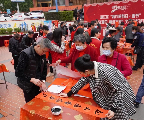 活動在一片歡聲笑語中拉開帷幕,領(lǐng)取春聯(lián)的桌子前早已排起了一條條長龍,書法家們揮毫潑墨,為轄區(qū)居民送上寫滿祝福的春聯(lián)?!盎⑻黼p翼前程遠 國展宏圖事業(yè)新”“移風(fēng)易俗春常在,人壽年豐福無邊”,雋秀的字體配上喜慶的祝福,引來現(xiàn)場群眾的陣陣稱贊,拿到春聯(lián)的大爺大媽們喜笑顏開,紛紛表示手寫的春聯(lián)更有寓意,更富年味?!盎顒臃諊鸁狒[、喜慶,活動內(nèi)容切實、惠民,更重要的是弘揚了我們的優(yōu)秀傳統(tǒng)文化,值得點贊”居民劉大叔說到。