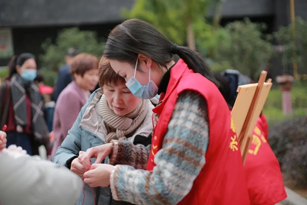 活動(dòng)中,老師們通過圖片展板、實(shí)物展示和現(xiàn)場(chǎng)操作等多種形式,手把手地指導(dǎo)大家動(dòng)手編織吉祥結(jié)、云雀結(jié)、金剛結(jié)、梅花結(jié)等樣式,帶動(dòng)群眾了解中華民族傳統(tǒng)編織文化。