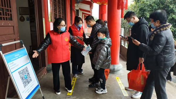 據(jù)了解,春節(jié)假期,林真和同事們每天都是這樣在景區(qū)度過的。他們和漳港街道、仙岐村、顯應(yīng)宮管委會的黨員干部、工作人員共同組成志愿服務(wù)隊,分為3組每天輪流值守在景區(qū)。志愿者們分區(qū)域分工協(xié)作,有的在景區(qū)大門值守,溫馨提醒每一位游客嚴格遵守疫情防控相關(guān)規(guī)定;有的維護景區(qū)秩序,引導(dǎo)游客文明有序參觀;有的發(fā)揮特長,義務(wù)做顯應(yīng)宮的歷史文化宣講員,從凌晨景區(qū)開門迎客一直忙到傍晚景區(qū)關(guān)門,為游客們提供專業(yè)服務(wù)。