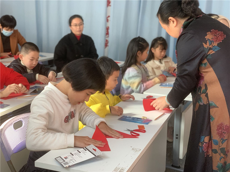 福海社區(qū)剪紙活動現(xiàn)場,老師耐心講解指導(dǎo)孩子們(溫麗卿供圖)